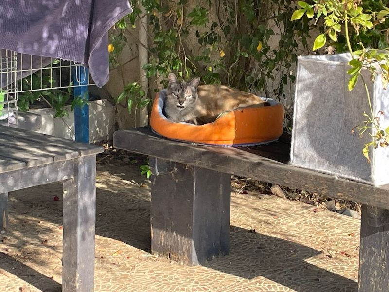 Ariel, Schwester von Anna und Angel, ebenso angriffslustig wie ihre zwei Schwestern und Teil der Simone auf Trab haltenden ‘Furien-Gang’, turnt, wenn sie gerade nicht im Katzenhaus randaliert, 🙃 tagsüber im Avocadofeld und auf der Weinlaube rum und dankt Gotti Cordula O. ganz herzlich für die Unterstützung.