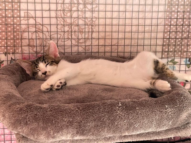 Auf einem LKW-Parkplatz an einer stark befahrenen Strasse entdeckt, konnte klein Epifania mit der Falle von da weggeholt und im Refugio in Sicherheit gebracht werden. Das zarte und verfressene Tigermädchen dankt seinem Gotti Martina T. herzlich für die Unterstützung.