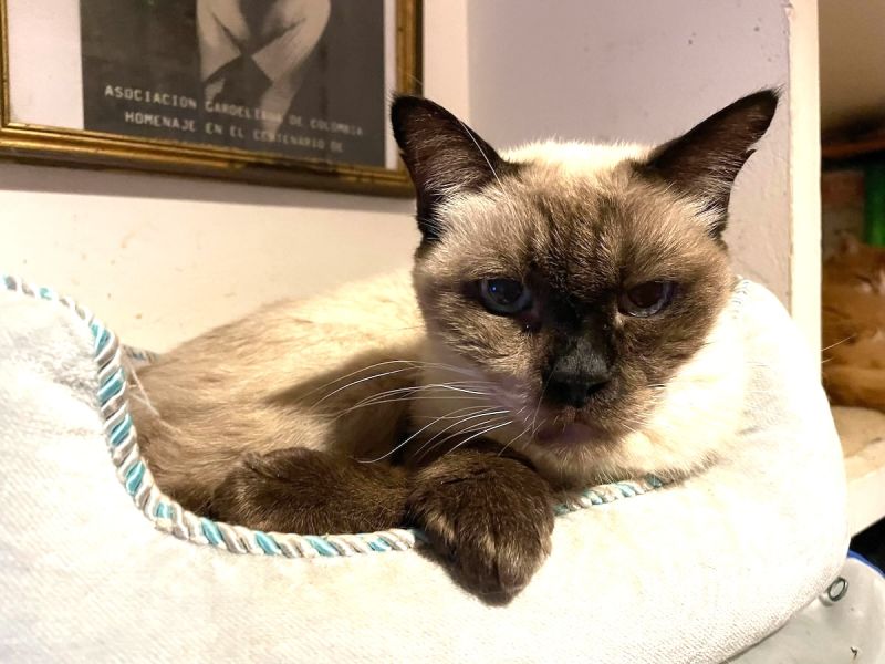In einer riesigen Kolonie in Sevilla, wo Katzen reihenweise verschwanden, manche, die man gut anfassen konnte adoptiert wurden, stand Moscú nicht an erster Stelle der Beliebtheitsliste. Von einer Tierschützerin mit der Falle eingefangen, verbrachte er danach mehrere Monate an einer Pflegestelle im Käfig, wartend auf bessere Zeiten. Letztendlich holte Simone den freundlichen netten alten Herrn zu sich, wo er sich mit allen gut verträgt und liebevoll betreut, die Freiheit und sein Bettchen im Stroh geniesst. Danke, liebe Irene B., bist du sein Gotti geworden.