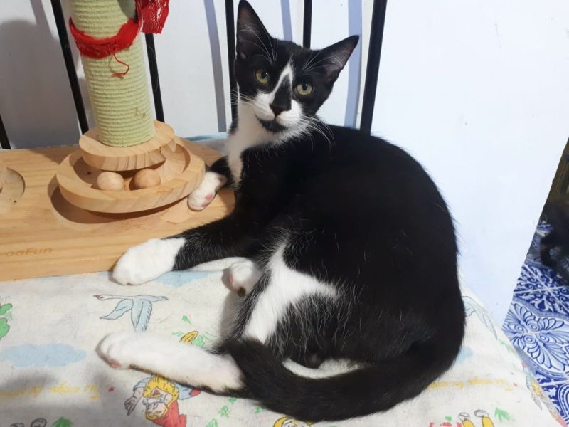 Vor zwei Jahren in einer Katzenkolonie aufgetaucht, landete Benjamin, in der Hoffnung auf eine Adoption erst in einer Tierhandlung und später in einem Campo für Ponys, Hunde, Katzen und Vögel. Dort war der arme Schatz über ein Jahr in einem kleinen Gartenhäuschen eingesperrt, ohne Kontakt zu Menschen und der Möglichkeit, mit seinesgleichen zu spielen. Über Umwege den Weg ins Refugio gefunden, kam bei der vermeintlichen ‘Wildkatze’ Benjamin ihr wirkliches Wesen hervor: ein zarter, lieber Knuddelbär, der es liebt, gestreichelt zu werden und der inzwischen seinen Lebensplatz als Mitglied des Büroassistenten-Teams von Simone gefunden hat. Worüber sich sein Gotti Catalina S. mega fest freut!