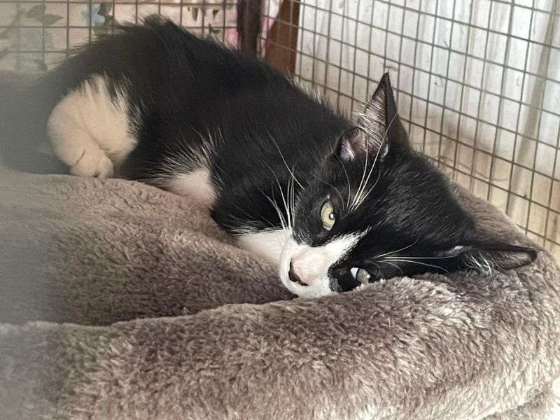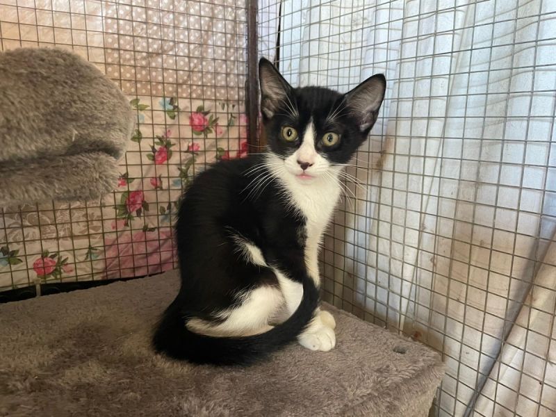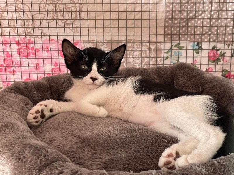 Das schwarz-weisse Katzenkind Hugo wurde mit der Mama und den beiden Geschwisterchen in einer Katzenkolonie gefunden und mit der Falle eingefangen. Nach dem Tierarztbesuch durfte die ganze Familie in die Auffangstation ziehen.
