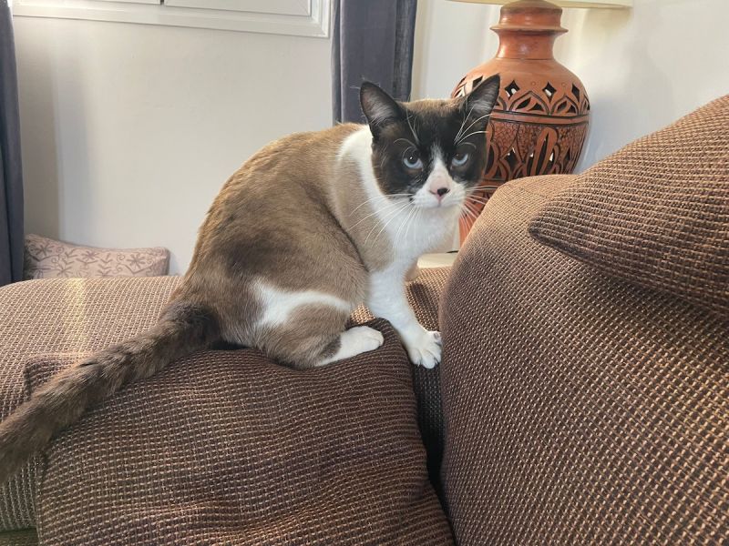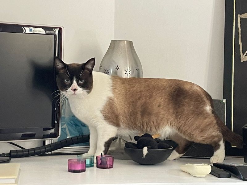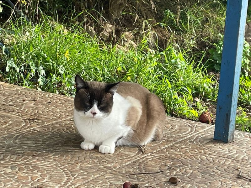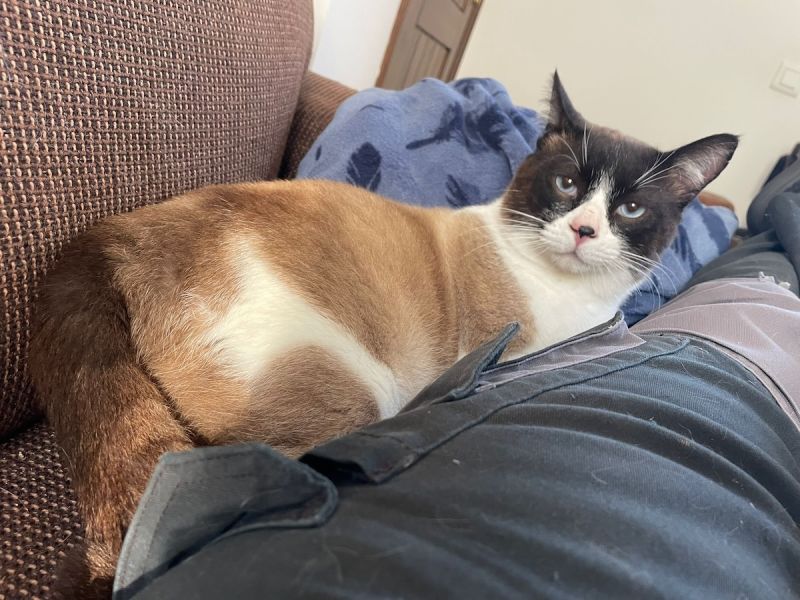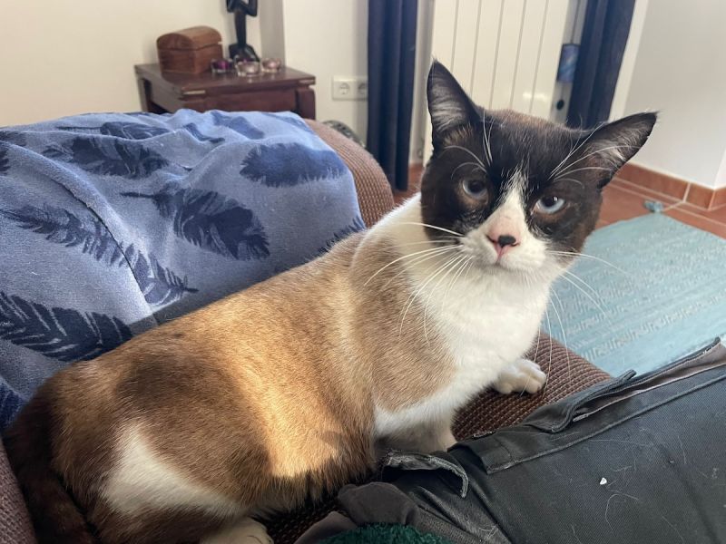 Der hübsche Snowshoe Mucki tauchte eines Tages im Garten der Auffangstation auf und blieb. Da die Auffangstation mit einem Zaun umgeben ist, ist anzunehmen, dass er einfach über den Zaun geworfen wurde.