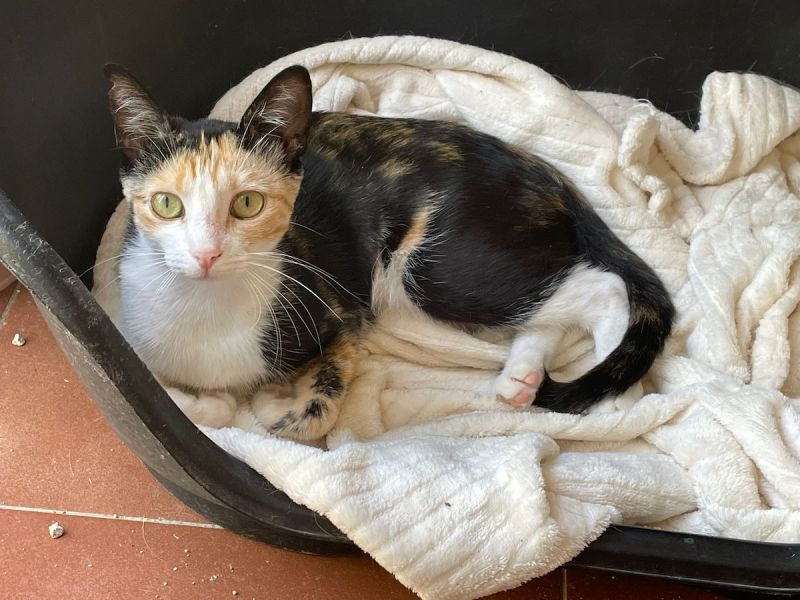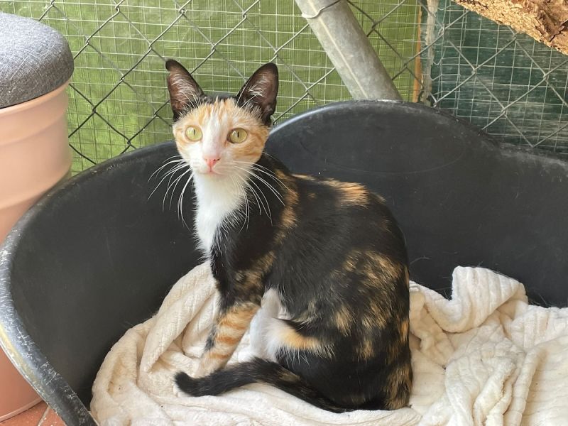 Das hübsche Tricolor Katzenmädchen Trixie wurde völlig eingeschüchtert in einer Katzenkolonie gefunden. Tierschützer nahmen Trixie mit und brachten sie in die Auffangstation.