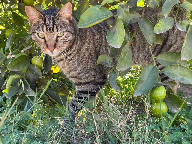 Ariel, Schwester von Anna und Angel, ebenso angriffslustig wie ihre zwei Schwestern und Teil der Simone auf Trab haltenden ‘Furien-Gang’, turnt, wenn sie gerade nicht im Katzenhaus randaliert, 🙃 tagsüber im Avocadofeld und auf der Weinlaube rum und dankt Gotti Cordula O. ganz herzlich für die Unterstützung.