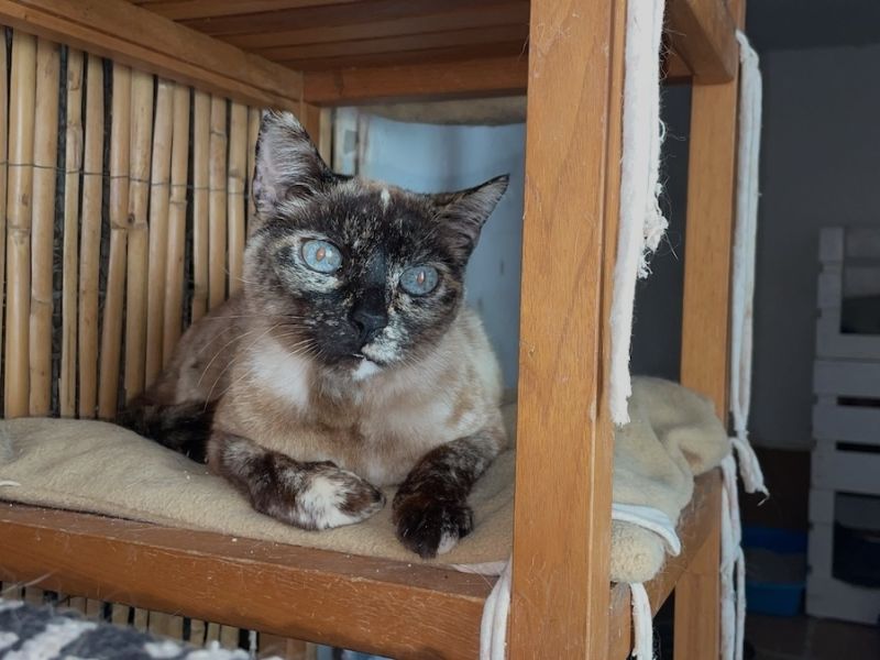 Die 5 Jahre alte Maisi wurde von Engländern, die in ihre Heimat zurückgekehrt sind, zurückgelassen und ist dabei, sich in Simones Auffangstation einzuleben. Noch braucht es etwas Zeit und Geduld, bis sie neues Vertrauen gefasst hat und den Freigang wird geniessen können. Wunderbar, dass die schöne Katzendame ein liebes Gotti gefunden hat, welches sie unterstützt. Herzlichen Dank Nicole S