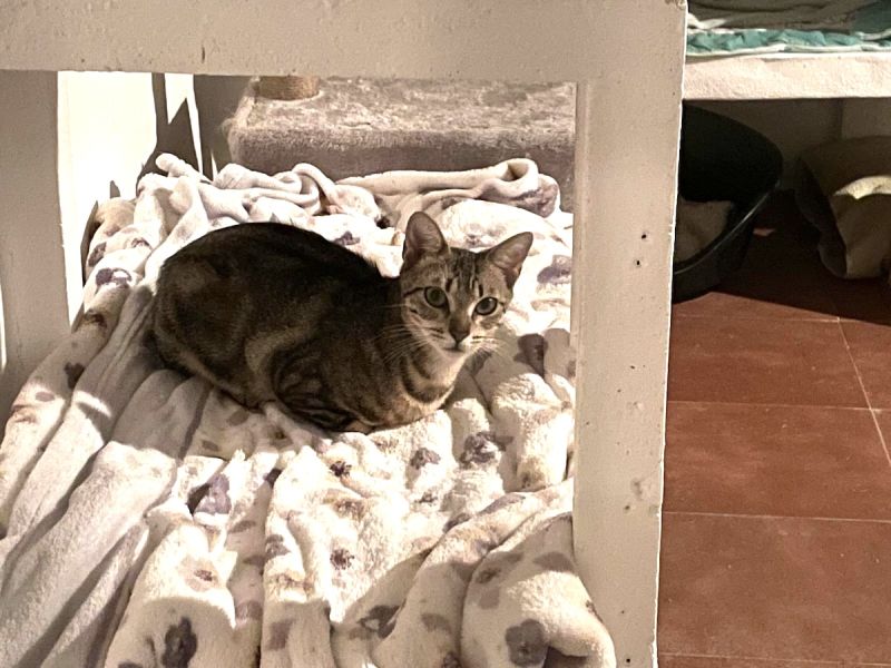 Auf einem LKW-Parkplatz an einer stark befahrenen Strasse entdeckt, konnte klein Epifania mit der Falle von da weggeholt und im Refugio in Sicherheit gebracht werden. Das zarte und verfressene Tigermädchen dankt seinem Gotti Martina T. herzlich für die Unterstützung.