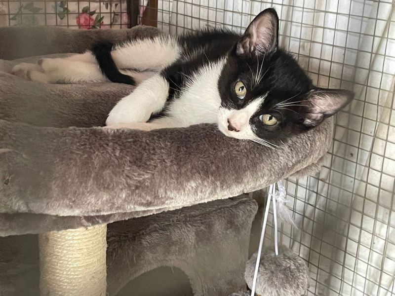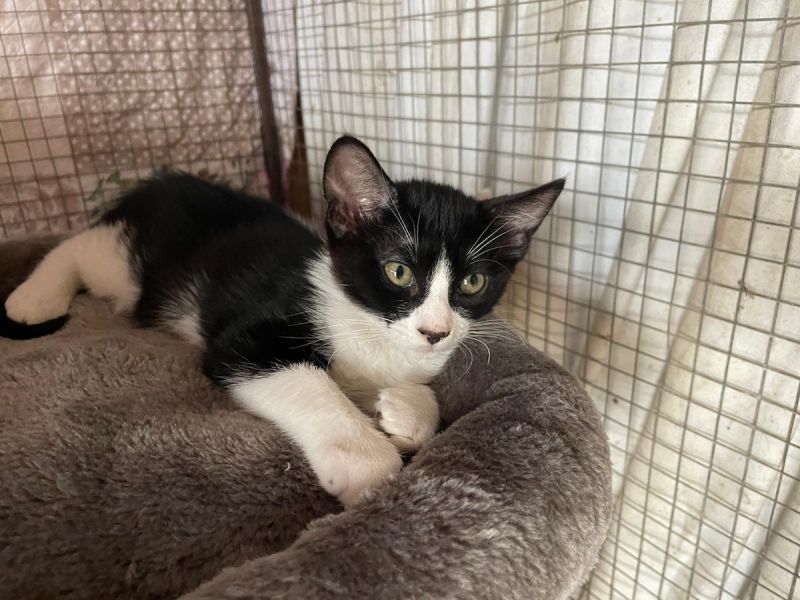 Das schwarz-weisse Katzenkind Hugo wurde mit der Mama und den beiden Geschwisterchen in einer Katzenkolonie gefunden und mit der Falle eingefangen. Nach dem Tierarztbesuch durfte die ganze Familie in die Auffangstation ziehen.