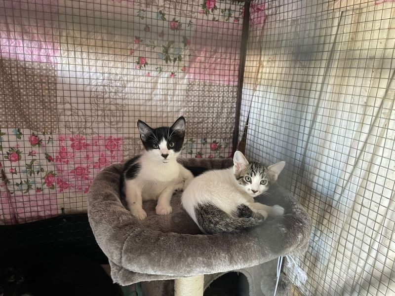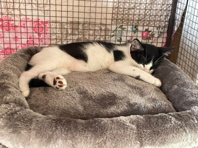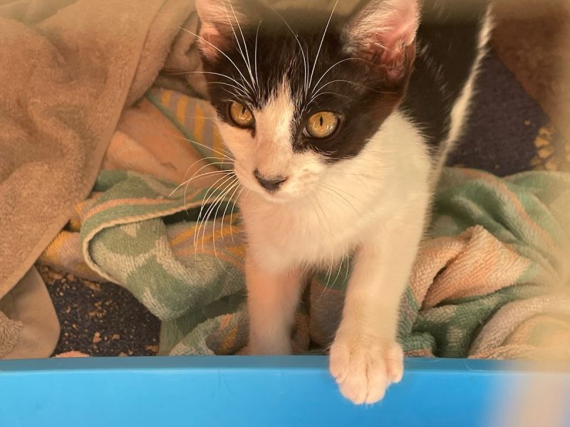 Das schwarz-weisse Katzenkind Timmy wurde mit der Mama und den beiden Geschwisterchen in einer Katzenkolonie gefunden und mit der Falle eingefangen. Nach dem Tierarztbesuch durfte die ganze Familie in die Auffangstation ziehen.